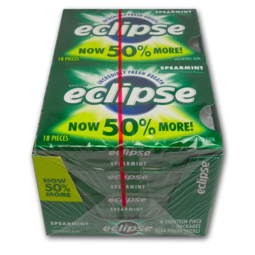 Eclipse Spearmint Sugarfree, Eclipse Gum, for incredibly fresh breath! Eclipse sugar-free gum provides incredibly fresh breath solutions for people whose on-the-go lifestyle demands a breath freshener that delivers. Eclipse launched in 1999 and has remained a leader in intense breath freshening ever since. The crunchy outer shell delivers a burst of flavor providing incredibly fresh breath and great taste! Eclipse Spearmint Sugarfree Gum, 18-piece packs, pack of 8 (total of 144 pieces) in a retail display tray.